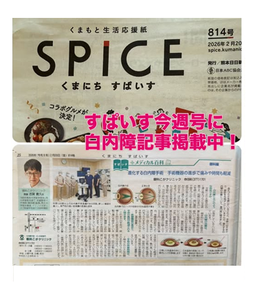 くまにちすぱいす2月20日号に、当院の白内障手術についての記事が掲載中です!昨年末に導入した白内障手術機器、UNITY(ユニティ)導入で、手術時間や痛みがより少なくなり、術後の回復も早いので、体力的にも気持ちの面でも、負担軽減が期待できます。