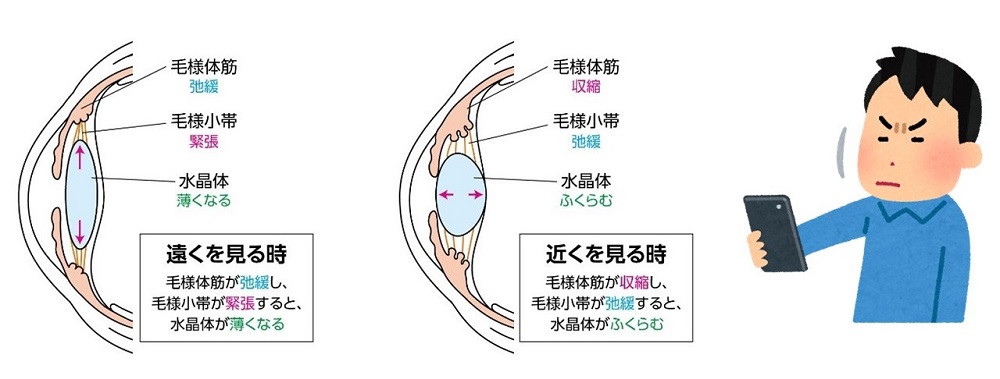 - A. 答えはNoです。人は目の中でレンズの役目をする水晶体が厚くなったり薄くなったりすることで、いろいろな距離にピントを合わせています (調節機能)。しかし、40歳頃から水晶体が硬くなり、調節機能が低下することが老眼です。ICLの手術の有無にかかわらず、老眼になる時期は変わらず、近くが見えにくくなったら老眼鏡で対処することになります。同年代で裸眼で良く見えている人と同じような状態になると考えていただくとよいと思います。